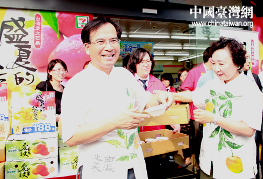 中國(guó)臺(tái)灣網(wǎng)6月18日上海消息 臺(tái)灣臺(tái)南縣縣長(zhǎng)蘇煥智18日攜夫人來(lái)到位于上海浦西的“7-11”超市局門店,向上海市民熱情推銷臺(tái)南縣特產(chǎn)愛(ài)文芒果。