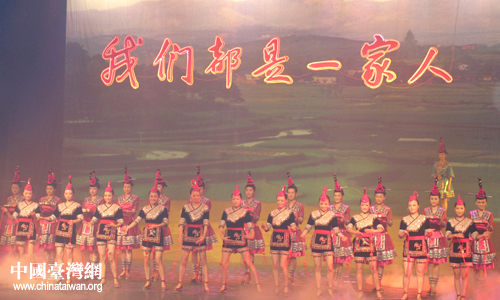 海峽兩岸少數(shù)民族聯(lián)誼交流會聯(lián)歡晚會以“我們都是一家人”為主題。圖為演員們在晚會上載歌載舞。(中國臺灣網(wǎng) 張碩 攝)