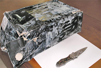 警方在斗毆現(xiàn)場找到沾有血跡的折疊刀及鞋盒。 來源:臺灣《蘋果日報》