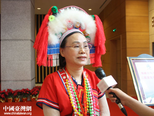 阿美族代表林靜玉在海峽論壇場(chǎng)外接受采訪。(中國(guó)臺(tái)灣網(wǎng) 徐麗華 攝)