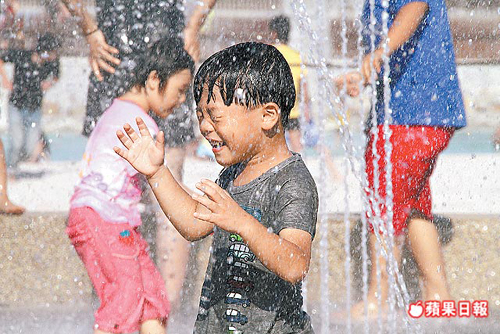 東石漁人碼頭免費開放供民眾消暑,間歇性的噴泉讓小朋友玩得不亦樂乎、驚呼連連。圖片來源:臺灣《蘋果日報》