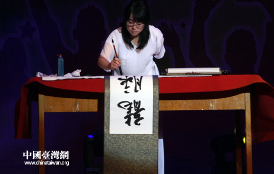 6日,全國(guó)臺(tái)聯(lián)2010年臺(tái)胞青年千人夏令營(yíng)在北京舉行開營(yíng)儀式。圖為北京高校青年現(xiàn)場(chǎng)書寫夏令營(yíng)主題:龍脈相傳,青春中華。(中國(guó)臺(tái)灣網(wǎng) 張弛 攝)