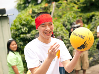 黃立行不畏高溫,前往“八八風(fēng)災(zāi)”災(zāi)區(qū)協(xié)助災(zāi)民,還跟小孩玩起躲避球。圖片來源:臺(tái)灣世界展望會(huì)