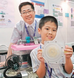 9歲鄧立維(前)是小發(fā)明王,他在父親鄧鴻吉(后)指導(dǎo)下發(fā)明了自來水發(fā)電機(jī),被廠商出價100萬元新臺幣購買專利。(圖:臺灣《聯(lián)合報》)