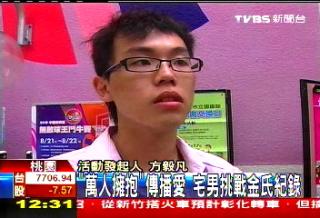 帶著粗框眼鏡、穿著襯衫的方毅凡,今年25歲,桃園人,從沒談過戀愛,生活里只有計算機,很少和人來往,是外人眼中的網(wǎng)絡宅男,這次發(fā)起“萬人擁抱”的活動,要在7月24日那天,在中壢龍崗大操場,挑戰(zhàn)吉尼斯世界紀錄。