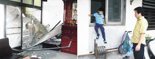 林基全說,昨天凌晨兩點“碰”一聲,他下樓查看,一樓鐵門和落地窗被撞毀,門已經(jīng)打不開,須爬窗子出去,“一看傻眼,散落一地的水泥有一、二百包”。