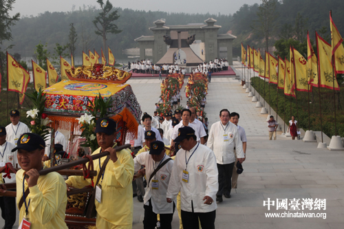 兩岸主祭人國臺(tái)辦交流局局長李維一、臺(tái)灣“中華神農(nóng)大帝協(xié)進(jìn)會(huì)”理事長陳福財(cái)?shù)裙簿锤呦悖ㄖ袊_(tái)灣網(wǎng) 趙輝 攝)