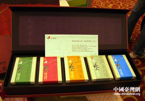 臺灣池上鄉(xiāng)農(nóng)會展出的禮品米,可以在桶蓋上刻上祝福的話(中國臺灣網(wǎng) 劉凱 攝)