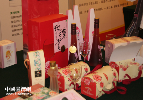 玫瑰花釀制出的玫瑰酒、玫瑰醋、玫瑰香水(中國臺灣網(wǎng) 劉凱 攝)