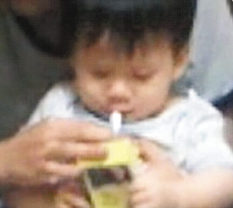 大人懷抱年約一歲的幼兒,把沒點(diǎn)燃的煙塞到男嬰嘴里。來源:臺(tái)灣《聯(lián)合報(bào)》