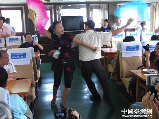 桂林市文化局在船上為臺灣嘉賓們準備了具有地方特色的節(jié)目,而臺灣嘉賓也不甘示弱,與桂林的藝術家輪流上場,于是在漓江上演了一場兩岸文化界人士的聯(lián)歡。