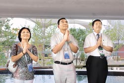 林毅夫(中)偕妻子在點(diǎn)燈水臺(tái)許下“美夢(mèng)成真”、“永保安康”心愿。來(lái)源:臺(tái)灣《旺報(bào)》