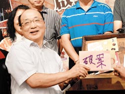 天助我也“破案了!”臺中市長胡志強昨天參加促銷觀光活動,伸手進(jìn)百寶箱撿寶時,竟然從上百張紙牌,抽到“破案”牌,大家直呼“太巧了”、“難道是天意”!連他都笑得合不攏嘴。(圖片來源:臺灣《中國時報》)