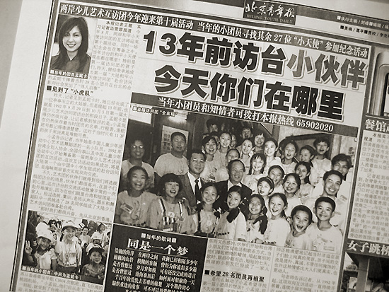 那是在2005年5月下旬的一天,辦公室有人在說,有個小天使在報上尋找當(dāng)年的小伙伴,名叫“莫尼卡”。我很驚詫這個名字很像蘇聯(lián)姑娘,更對這件事產(chǎn)生了興趣。迫不及待地找來了那份《北京青年報》,果然看到了那則特殊的“尋人啟事”,確切地說,那是記者的一份采訪報道,題目是《13年前訪臺的小伙伴,今天你們在哪里?》內(nèi)容正是第一屆大陸和平小天使孟妮卡在尋找當(dāng)年的小伙伴。那時,我已經(jīng)離開了供職近20年的雜志社,調(diào)到新的部門工作,而恰巧的是,這個部門正在籌備迎接臺灣第十屆和平小天使的訪問。