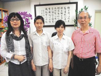 陳淑玲(右二)今年讀桃園縣振聲高中進修部二年級,三年級的女兒吳宜柔(左二)是媽媽的“學(xué)姐”,校長張湘君(左)勉勵她們用功讀書。 來源:臺灣《聯(lián)合報》
