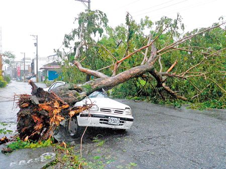 “凡亞比”臺(tái)風(fēng)威力驚人,將路樹連根拔起,壓毀停在一旁的車輛,幸無(wú)人傷亡。來源:臺(tái)灣《中國(guó)時(shí)報(bào)》