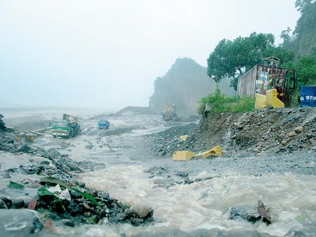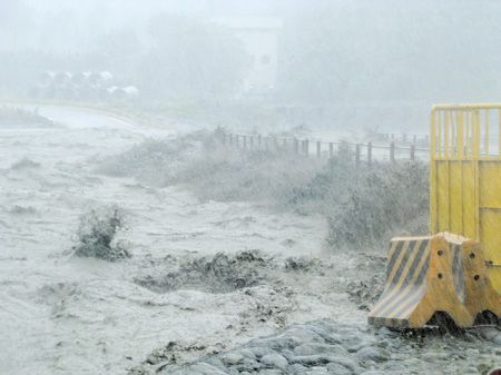 高雄縣荖濃溪水暴漲,湍急溪水漫過六龜大橋便道,無(wú)法通行。來源:臺(tái)灣《中國(guó)時(shí)報(bào)》