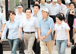 馬英九(前排左二)25日在黃昭順(前排左一)、高雄市長(zhǎng)陳菊(后排右一)等人陪同下,前往高雄文藻外語(yǔ)學(xué)院了解“凡亞比”臺(tái)風(fēng)重創(chuàng)后的復(fù)原狀況,不過(guò)陳菊陪同時(shí)總是和馬英九保持距離。