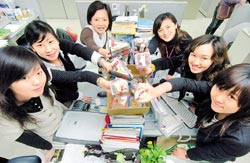 網(wǎng)絡(luò)團(tuán)購(gòu)在臺(tái)灣蔚為風(fēng)尚,圖為一家臺(tái)灣企業(yè)的員工們開(kāi)心地展示團(tuán)購(gòu)戰(zhàn)利品。來(lái)源:臺(tái)灣《中國(guó)時(shí)報(bào)》