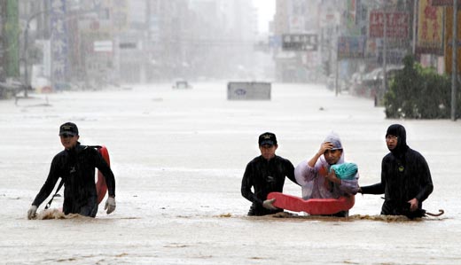 臺灣宜蘭21日雨量驚人,蘇澳鎮(zhèn)淹水嚴(yán)重,救護(hù)人員進(jìn)入救援。來源:臺灣《聯(lián)合報》