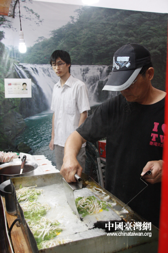 在人氣最旺、大排長(zhǎng)龍的臺(tái)南蚵仔煎攤位前,想要擠上前去還真是要頗費(fèi)一番力氣。據(jù)黃姓店主介紹,蚵仔煎是臺(tái)灣最具有代表性的小吃之一,自己從事這一行已有30年的時(shí)間,現(xiàn)在重點(diǎn)在大陸發(fā)展。看到臺(tái)灣特色美食如此受歡迎,黃老板也非常開心,希望更多人品嘗到他的手藝。