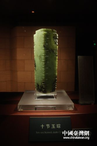 十節(jié)玉琮。由一塊質(zhì)地細密的上佳整玉雕琢完成,通體呈淡青綠色,九條細小的橫槽將器身分為十節(jié),每節(jié)棱角上均刻有紋飾。有專家認為,此玉琮比金沙遺址更早1000年。(中國臺灣網(wǎng) 馬迪 攝)