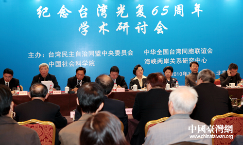 中國臺(tái)灣網(wǎng)10月25日北京消息 臺(tái)灣民主自治同盟中央委員會(huì)、中華全國臺(tái)灣同胞聯(lián)誼會(huì)、中國社科院和海峽兩岸關(guān)系研究中心25日下午,共同在北京臺(tái)灣會(huì)館舉辦研討會(huì),紀(jì)念臺(tái)灣光復(fù)65周年。
