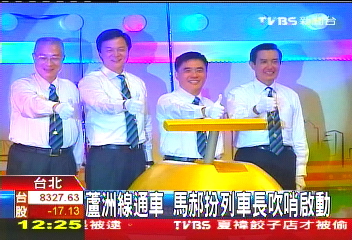 中國(guó)臺(tái)灣網(wǎng)11月3日消息 據(jù)臺(tái)灣TVBS電視臺(tái)報(bào)道,臺(tái)北捷運(yùn)蘆洲線今(3)日下午正式通車,臺(tái)灣地區(qū)領(lǐng)導(dǎo)人馬英九、臺(tái)當(dāng)局“行政院長(zhǎng)”吳敦義、臺(tái)北市長(zhǎng)郝龍斌、臺(tái)北縣長(zhǎng)周錫瑋打扮成臺(tái)北捷運(yùn)列車長(zhǎng),正式啟動(dòng)蘆洲線。