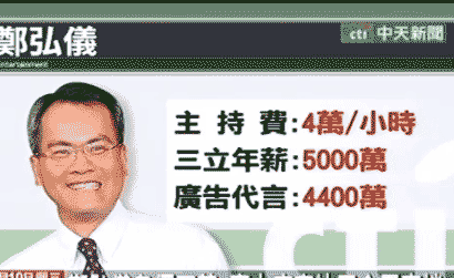 據(jù)報(bào)道,作為臺灣三立電視臺的招牌主持人,鄭弘儀的收入頗豐。他在臺灣三立電視臺的純年薪為5000萬元,主持節(jié)目另算,每小時為4萬元。加上每年4000萬的廣告費(fèi),鄭弘儀的收入逼近億元大關(guān)。