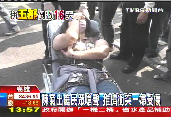 綠營支持者在場外高喊著“加油、加油”,藍(lán)營支持者則在場外高喊著“陳菊下臺”,聲浪一浪高過一浪。雖然有警察在中間隔著對峙人員,但是沖突拉扯不斷。陳菊應(yīng)訊結(jié)束欲驅(qū)車離開時,雙方?jīng)_突程度進(jìn)一步升級,場面已經(jīng)亂成一鍋粥,陳菊要走出來困難重重。陳菊一方派出隨扈開道,不管是媒體還是支持者通通都得避讓。緊跟陳菊的女隨扈果真“勇猛”,她雙手一推,混亂中的1名藍(lán)營支持者便倒地,被送醫(yī)急救。