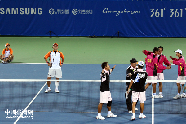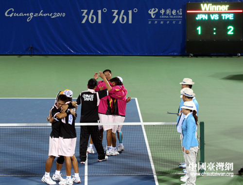中國(guó)臺(tái)灣網(wǎng)11月15日廣州消息 第十六屆廣州亞運(yùn)會(huì)軟式網(wǎng)球男子團(tuán)體賽決賽,14日下午在廣州天河體育中心球場(chǎng)舉行,中華臺(tái)北隊(duì)在軟式網(wǎng)球男子團(tuán)體賽中上演“驚天大逆轉(zhuǎn)”,以2:1戰(zhàn)勝衛(wèi)冕冠軍日本隊(duì),摘獲代表團(tuán)在本屆亞運(yùn)會(huì)上的首枚金牌。(記者 李徽)