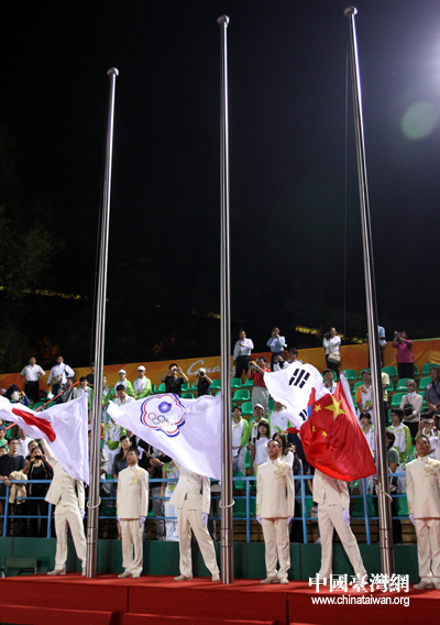 中華臺(tái)北隊(duì)軟式網(wǎng)球男團(tuán)奪金,現(xiàn)場(chǎng)升起中華臺(tái)北奧委會(huì)會(huì)旗。(中國(guó)臺(tái)灣網(wǎng) 鐘寶華 攝)