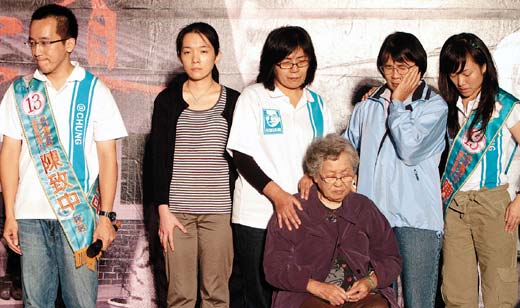 角逐高雄市議員的陳致中(左),昨晚舉辦一場(chǎng)阿扁坐牢惜別晚會(huì),扁媽陳李慎(右三)、扁姐,還有陳幸妤(左二)都來(lái)到會(huì)場(chǎng)。(記者劉學(xué)圣/攝影 圖片來(lái)源:臺(tái)灣《聯(lián)合報(bào)》)