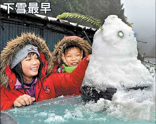 宜蘭縣與臺中縣交界的臺7甲線思源埡口附近昨清晨飄下全臺第一場瑞雪,孩童高興地堆起小雪人玩樂。圖片來自網(wǎng)絡(luò)