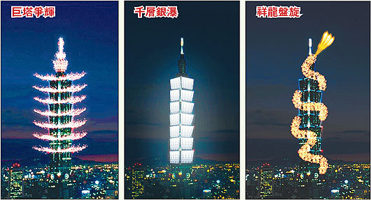 臺(tái)北101大樓昨天公布三大主題模擬動(dòng)畫,其中以“祥龍盤旋”最驚人,由蔡國(guó)強(qiáng)縝密設(shè)計(jì),利用外墻架設(shè)鋼板射出煙火,制造彷彿一條金龍盤旋而上的視覺效果,最后在508米的塔尖射出光束,代表臺(tái)灣向上起飛,經(jīng)濟(jì)也上看最高點(diǎn)。(中國(guó)臺(tái)灣網(wǎng) 王賽賽)