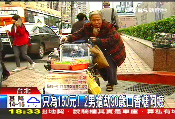 中國臺灣網(wǎng)12月24日消息 據(jù)臺灣TVBS電視臺報(bào)道,臺灣近日發(fā)生一樁讓人匪夷所思的搶劫案。2名青年男子欲當(dāng)街搶走一位賣口香糖的90歲老婦的70條口香糖、21包牛奶糖,并揚(yáng)言“不給東西,就拿150元(新臺幣,約合32元人民幣)來,否則就把你打死”。臺北警方目前已將這2名男子逮捕,分別依搶奪罪、恐嚇取財(cái)未遂罪起訴2人,求處重刑。