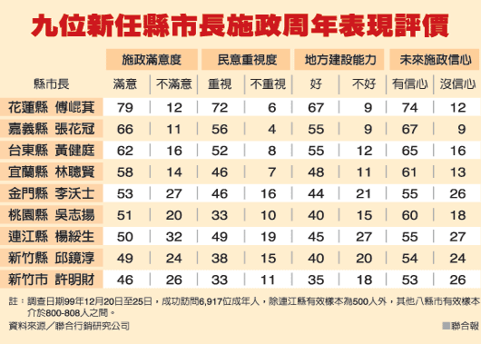 中國(guó)臺(tái)灣網(wǎng)12月27日消息 據(jù)臺(tái)灣《聯(lián)合報(bào)》報(bào)道,臺(tái)灣2009年底“三合一”(縣市長(zhǎng)、縣市議員、鄉(xiāng)鎮(zhèn)市長(zhǎng))選舉選出17位縣市首長(zhǎng),其中有9位是新人,今年12月20日就職滿周年,臺(tái)媒對(duì)于他們上任一年來的表現(xiàn)進(jìn)行了民意調(diào)查。根據(jù)調(diào)查,花蓮縣長(zhǎng)傅昆萁施政好評(píng)達(dá)7成9,一枝獨(dú)秀領(lǐng)先其它縣市長(zhǎng);居末的新竹市許明財(cái),僅獲4成6好評(píng)。