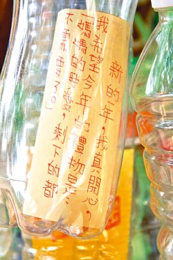 渴求親情▲云林縣古坑鄉(xiāng)偏遠(yuǎn)小學(xué)華南小學(xué)的飲料瓶心愿樹,讓全校70個(gè)小孩放上自己的愿望,其中有個(gè)小女孩寫下“希望今年禮物是媽媽的母愛,剩下的都不需要了”,令人鼻酸。圖片來源:臺(tái)灣《中國(guó)時(shí)報(bào)》