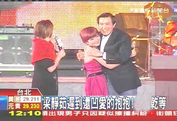 去年圣誕夜,馬英九到臺中報佳音,原本制作單位希望歌手梁靜茹7點25分要到場準備,7點45分要唱歌,結(jié)果梁靜茹直到8點才趕到,馬英九干坐在后臺近半個小時;主辦單位急得跟熱鍋上的螞蟻,結(jié)果遲到半小時的梁靜茹,還在臺上跟馬英九要“愛的抱抱”。