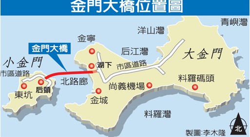 臺當局“交通部”高速公路新建工程局長曾大仁表示,金門大橋預(yù)定2016年6月完工通車,屆時將是臺灣最長的跨海大橋。根據(jù)設(shè)計,金門大橋工程含兩端引道,全長約5.4公里,跨海域的主橋長約4.8公里,橋面15米寬。