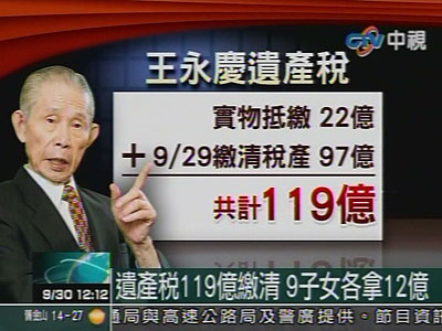 王永慶2008年10月突然過世,據(jù)指出,王永慶在島內(nèi)共留下595億元的遺產(chǎn),共需繳交119億元的遺產(chǎn)稅,其中,在去年9月有113億元入帳,使得9月份的遺產(chǎn)稅實征凈額達133億元,創(chuàng)下的史上單月新高紀錄。另外6億元的實物抵繳部分,也在11月由臺當(dāng)局“財政部國有財產(chǎn)局”完成土地變更為公有。119億元的遺產(chǎn)稅悉數(shù)上繳,如果再加上28億元的贈與稅,合計王家去年共繳交了147億元的遺贈稅。(中國臺灣網(wǎng) 馮江)