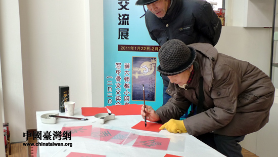有興致的顧客也在民俗小店里揮毫為兔年討個(gè)好彩頭(中國臺(tái)灣網(wǎng) 李徽 攝)