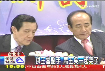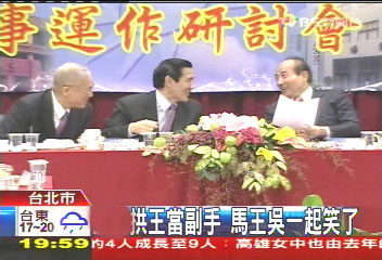 中國(guó)臺(tái)灣網(wǎng)2月21日消息 綜合臺(tái)灣媒體報(bào)道,國(guó)民黨今(21)日下午召開臺(tái)“立法行政部門議事運(yùn)作研討會(huì)”,藍(lán)營(yíng)“立委”關(guān)切2012“大選”馬英九的副手議題,認(rèn)為不論“馬吳”或“馬王”配,都應(yīng)盡速確定。部分“立委”甚至當(dāng)面直接向馬英九“逼宮”,表示很多藍(lán)軍支持者建議由王金平擔(dān)任馬英九競(jìng)選連任的副手;而坐在臺(tái)下的馬英九、王金平、吳敦義聽后都尷尬的笑了起來。