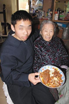 廖子淳(左)每天中午從學(xué)校趕回家,來回12公里專程為祖父母做午餐,祖母(右)表示很心疼。圖片來源:臺灣《聯(lián)合報(bào)》