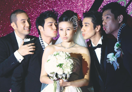唐志中(左)與張庭緁(中)昨天結(jié)婚,好友陳建州(右)、王力宏(右二)、潘瑋柏(左二)當(dāng)伴郎。圖片來(lái)源:臺(tái)灣《聯(lián)合報(bào)》
