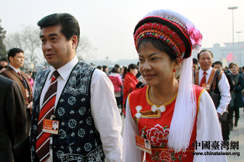 3月5日,十一屆全國人大四次會議在北京人民大會堂開幕。身穿民族服飾的大代表走入會場,成為兩會一道亮麗的風景。(中國臺灣網(wǎng) 董潔 攝)