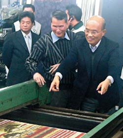 蘇貞昌(右)昨日參觀新北市印染廠(chǎng),至于是否投入2012“大選”,他首度松口表示“正認(rèn)真考慮中”。圖片來(lái)源:臺(tái)灣《聯(lián)合報(bào)》