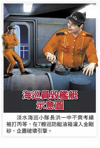 前年11月27日,洪一中(43歲)因不滿先前喝酒被上級懲處,年終考績只有丙等,伙同分隊長李文波(45歲)共謀將硬度極高的金剛砂倒入7艘平均造價7000萬新臺幣)的巡防艦艇引擎,企圖破壞引擎報復(fù)。幸好海巡隊在保養(yǎng)時及時發(fā)現(xiàn),耗費65萬元新臺幣逐一檢查清除,才避免船只損壞。