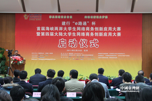 中國臺灣網(wǎng)3月24日北京消息 由中國互聯(lián)網(wǎng)協(xié)會和中國臺灣網(wǎng)共同主辦的“建行e路通杯首屆海峽兩岸大學(xué)生網(wǎng)絡(luò)商務(wù)創(chuàng)新應(yīng)用大賽暨第四屆大陸大學(xué)生網(wǎng)絡(luò)商務(wù)創(chuàng)新應(yīng)用大賽”今日上午在北京舉行啟動儀式。主辦方表示,期望能借此加強(qiáng)兩岸互聯(lián)網(wǎng)業(yè)界、以及高校學(xué)生的交流借鑒,促進(jìn)共同發(fā)展。