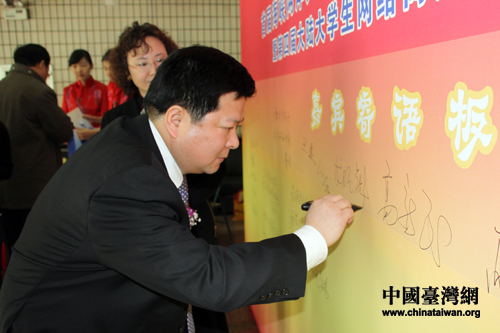 啟動(dòng)儀式開始前,國務(wù)院臺(tái)辦主任助理龍明彪在嘉賓寄語板留言。 (中國臺(tái)灣網(wǎng) 王偉 攝)